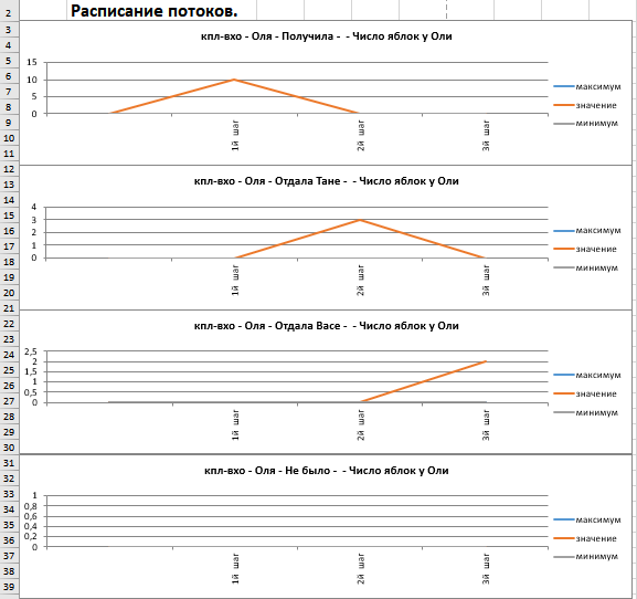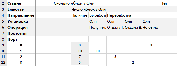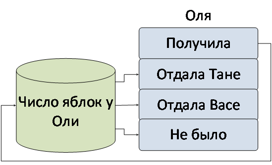 Потоки: из установки «Оля» от операции «Получила» в емкость «Число яблок у Оли», а оттуда в установку «Оля» к операциям «Отдала Тане», «Отдала Васе», «Не было», а из них – неизвестно куда, может быть Таня и Вася съели яблоки.