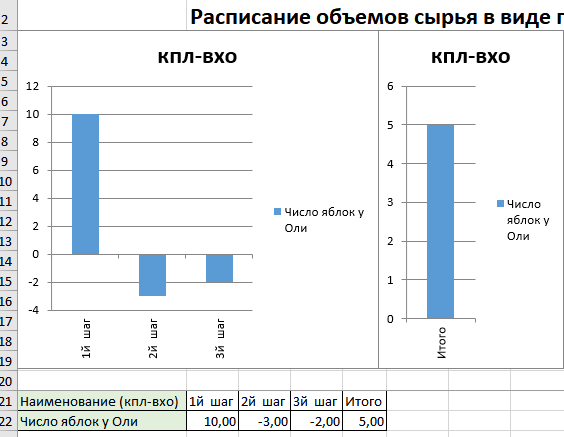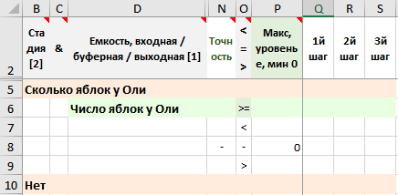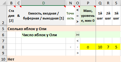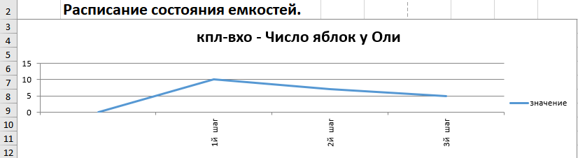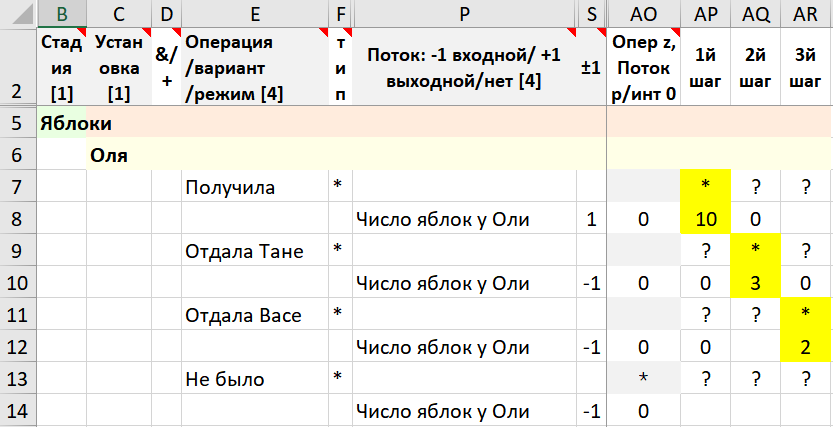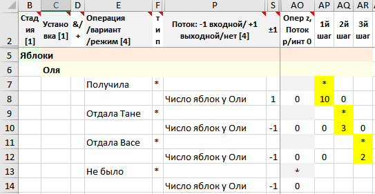 • Заданы «фрагменты решения» – «Получила» (знак потока «+1») и «Отдала…» (знак потоков «–1»), и потоки – число яблок.