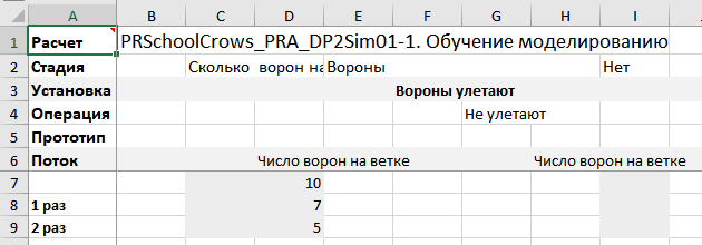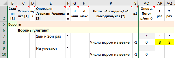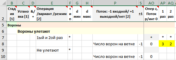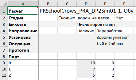 • Заданы «фрагменты решения» – вороны улетают 1й и 2й раз, и потоки – число улетающих ворон.