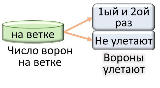 «Считаем ворон». Дано: Прилетели 10 ворон и сели на ветку. Сначала улетело 3 вороны, а потом улетело ещё 2 вороны. Определить: Сколько ворон на ветке?