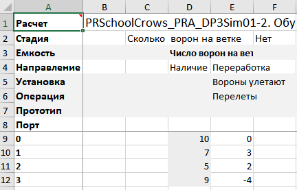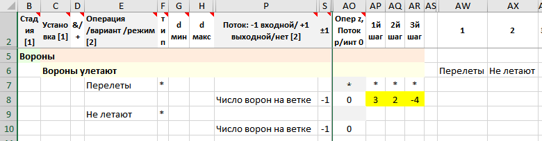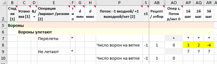 • Заданы «фрагменты решения» – вороны улетают 1й и 2й раз, потом часть возвращается, и потоки – число улетающих и вернувшихся ворон.