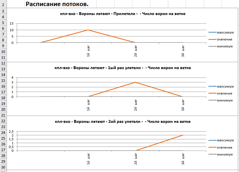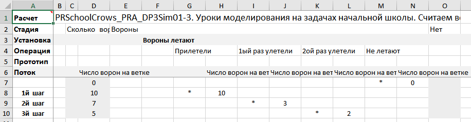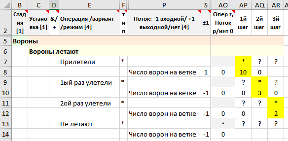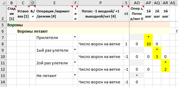 • Заданы «фрагменты решения» – вороны прилетели (знак потока «+1») и улетают (знак потоков «–1»), и потоки – число прилетевших и улетающих ворон.