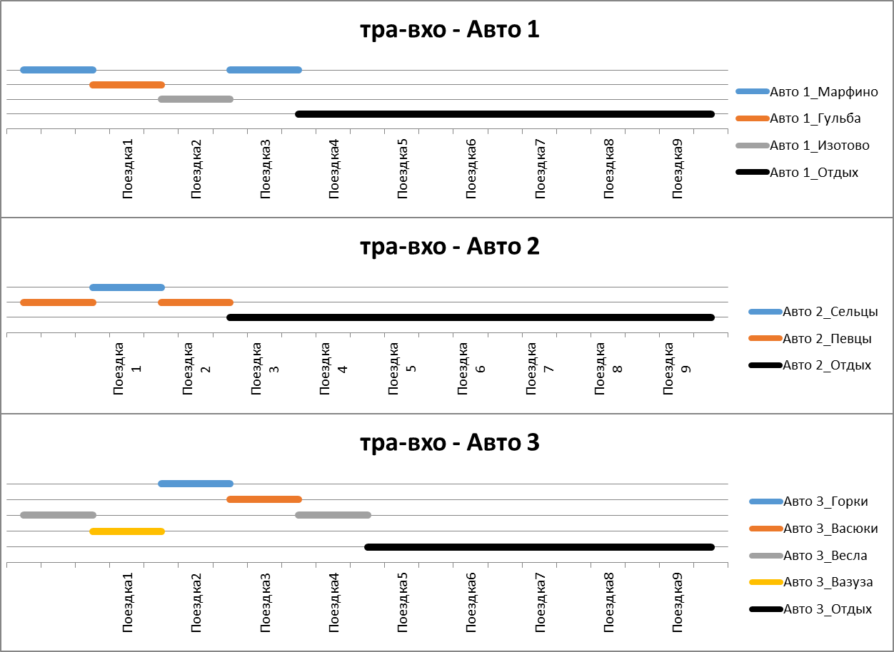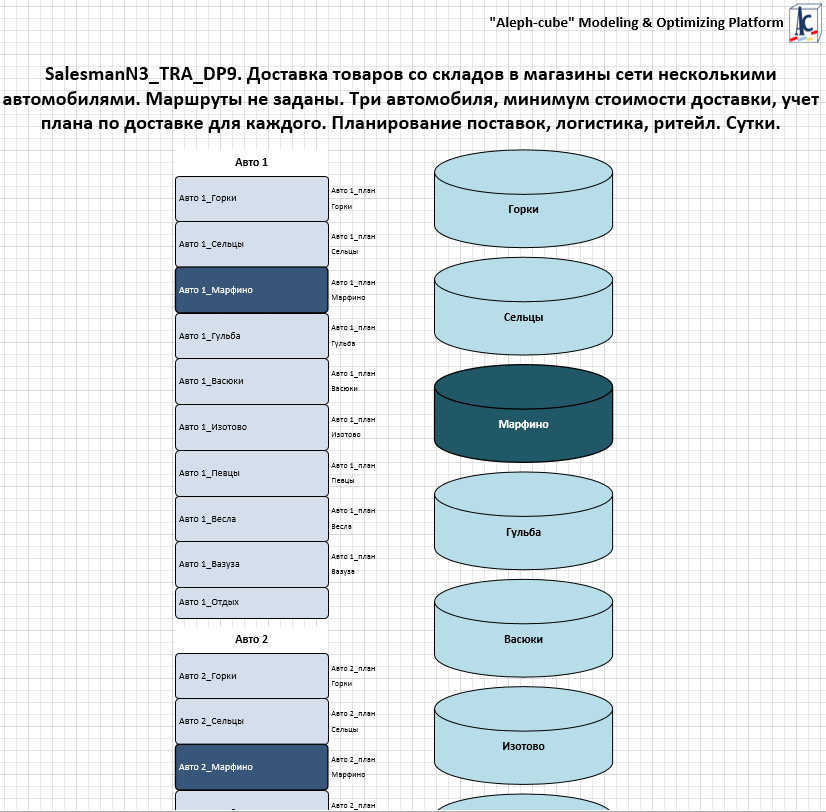 Три автомобиля из трех складов, расположенных в разных пунктах, доставляют товары по 9 магазинам, расположенных в 9 разных населенных пунктах.