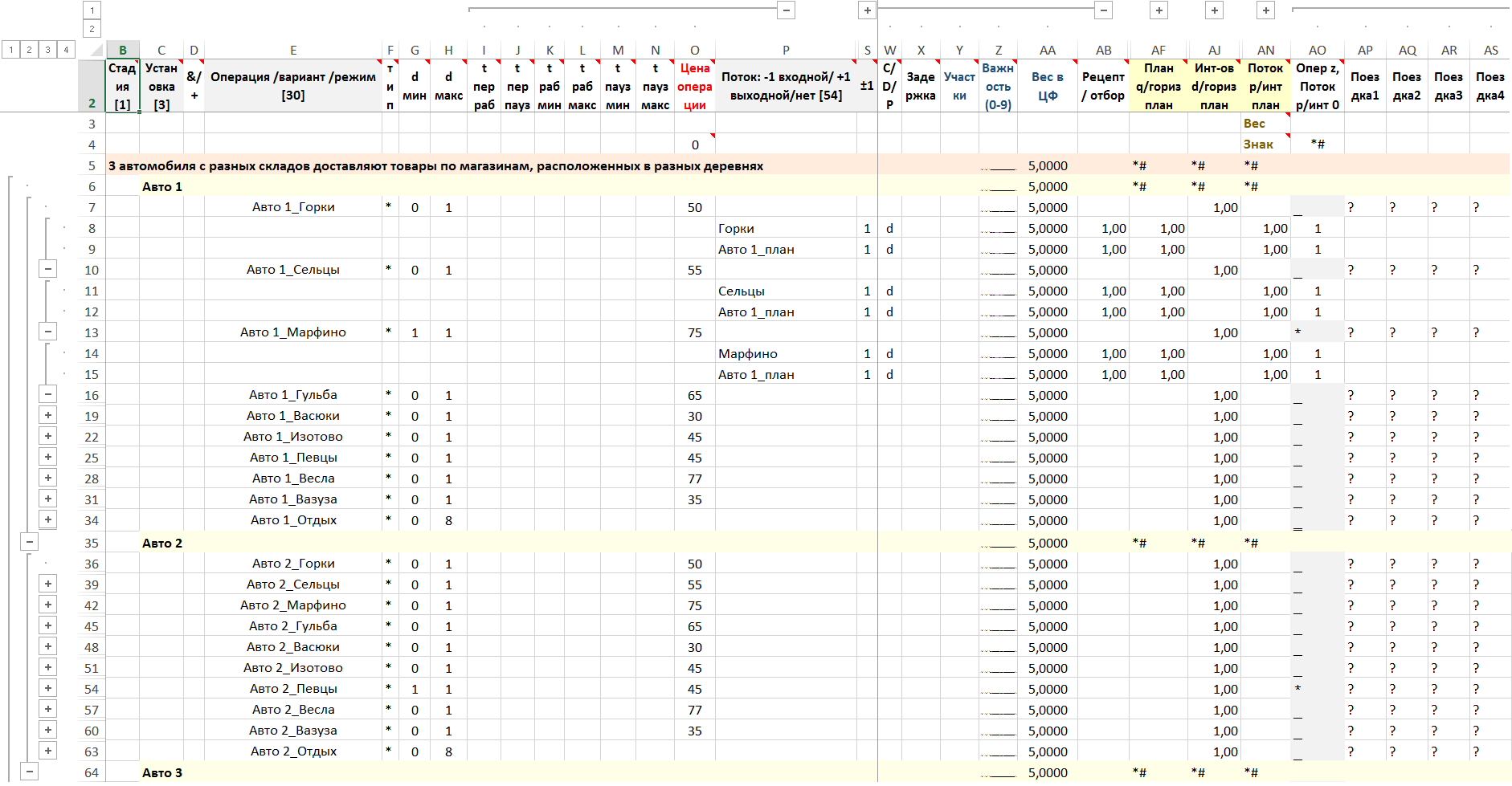 Установки отражают автомобили, доставляющие товары. Операции установок отражают доставку в магазины, располагающиеся в населенных пунктах. Потоки операций отражают факт доставки товара в магазины и выполнение плана по доставке для каждого автомобиля.