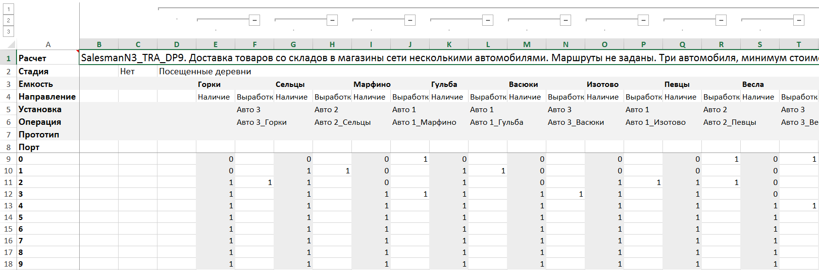 • Требование доставить в определенный магазин задается в емкостях, емкости названы по названию населенного пункта, где он находится. Сейчас требуется, чтобы во все магазины была доставка и ровно один раз