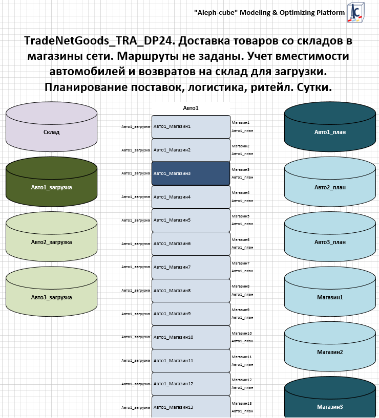 Задача основана на см. Объект TradeNet. Доставка товаров со складов в магазины сети. Маршруты не заданы. Несколько автомобилей, простои штрафуются.