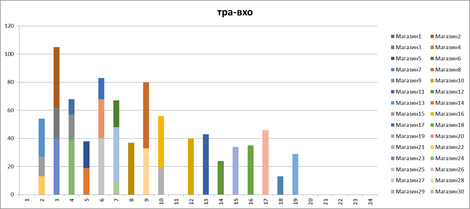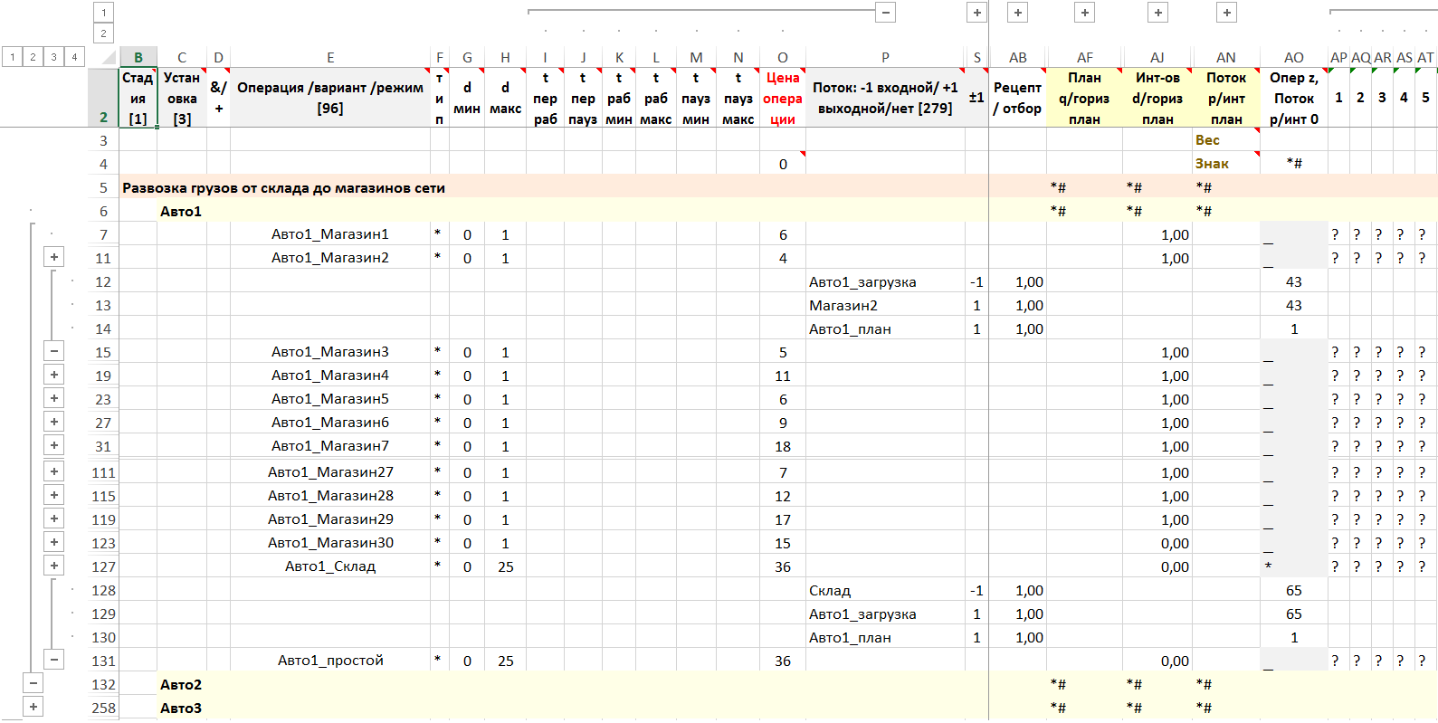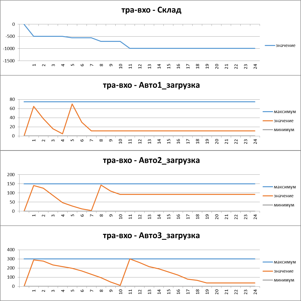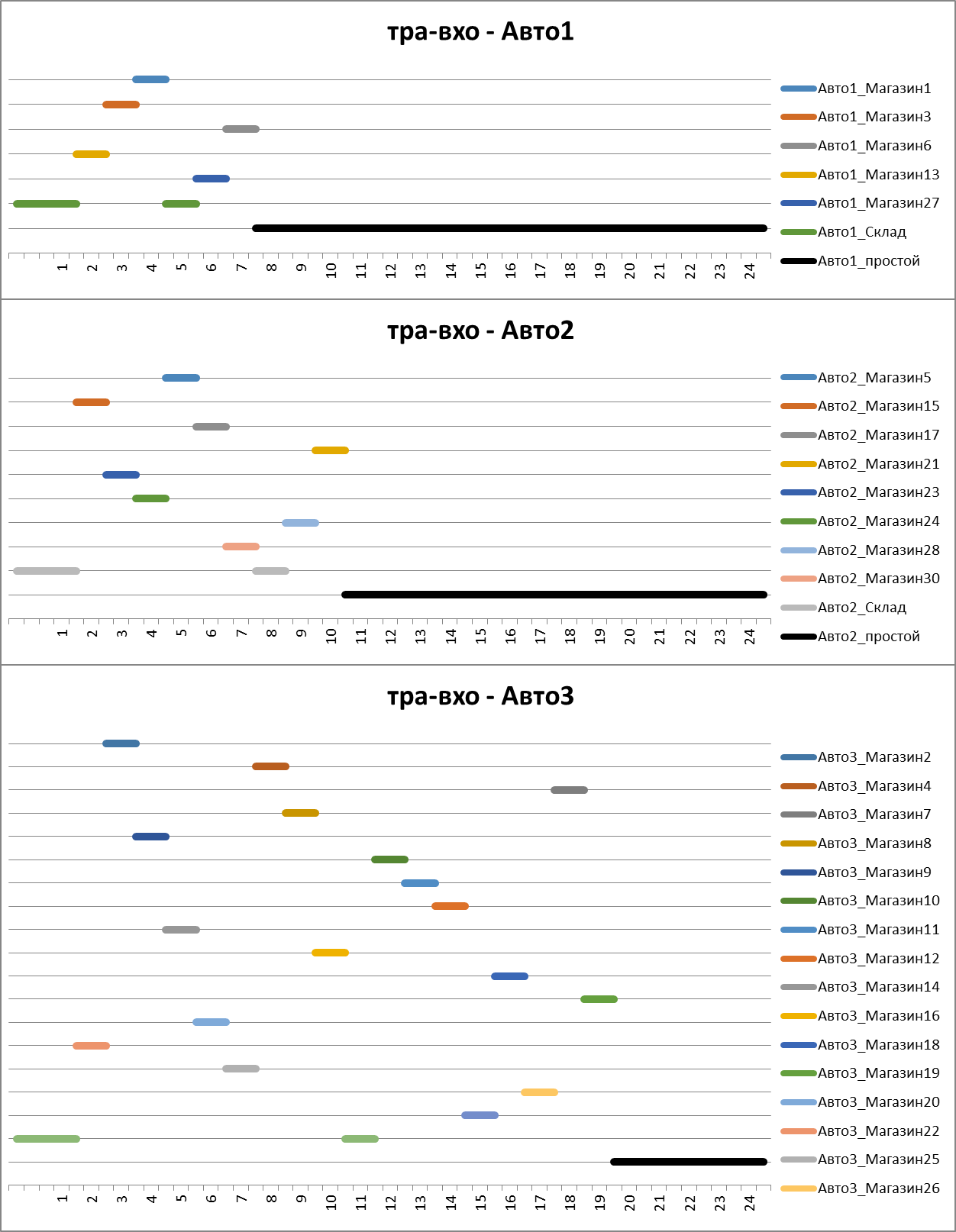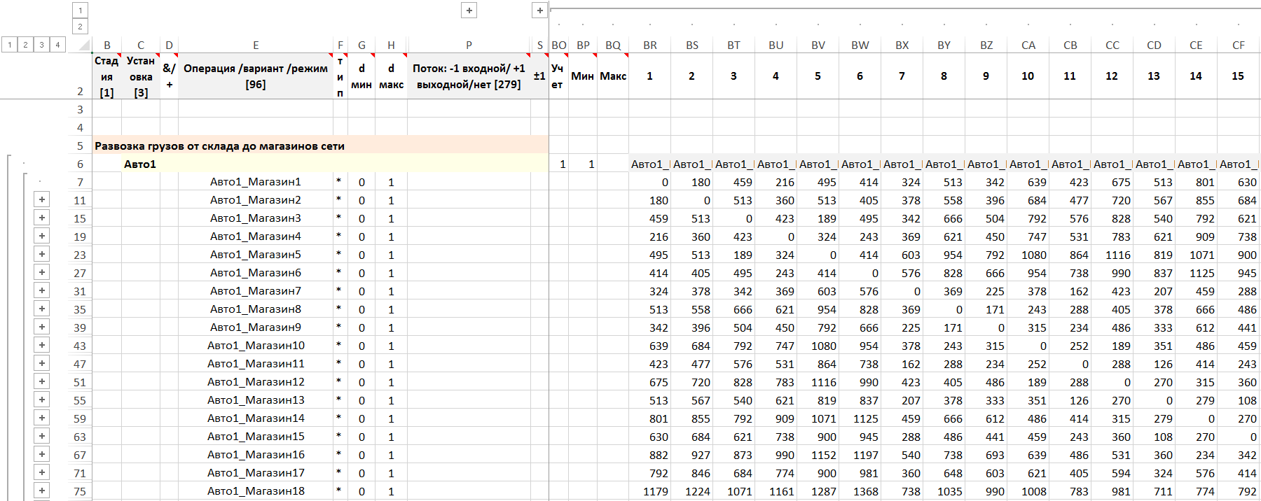 Максимально возможное число магазинов, в которые может доставить один автомобиль не ограничивается. Можно задать фрагментами графиков число интервалов, в которые автомобиль будет активен, что, в зависимости от учета времени доставки товара в магазин может означать: максимальное число магазинов для доставки одним автомобилем (время доставки = 1), максимальное время работы автомобиля (время доставки ≠ 1), либо используя емкости Авто_*_план, регулирующие число посещенных пунктов.
