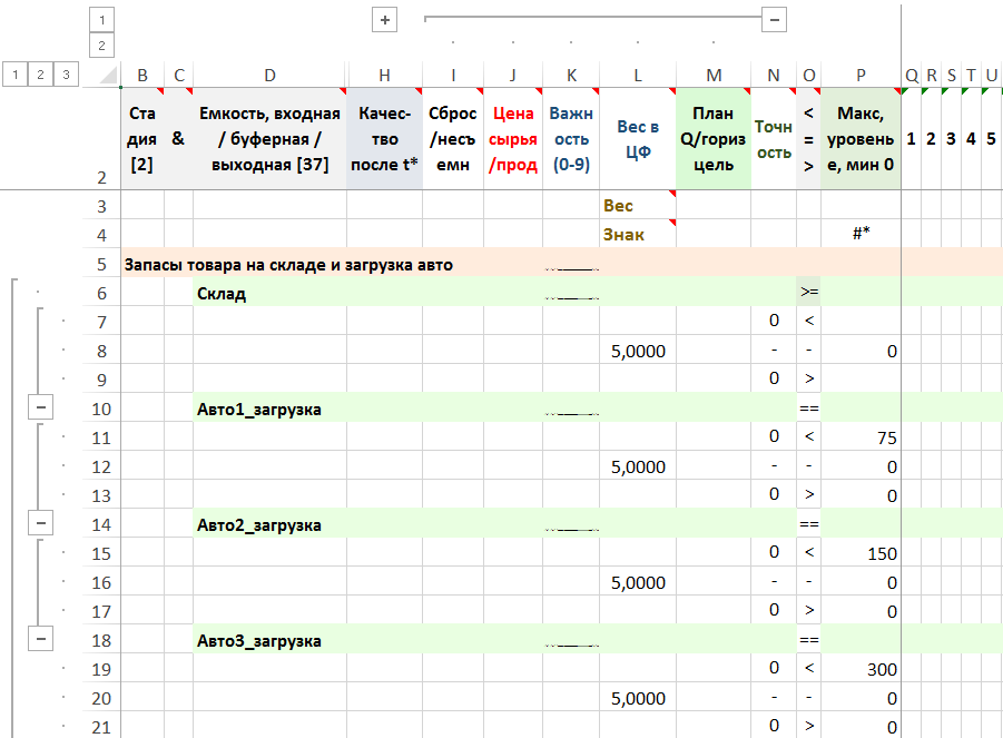 Рисунок. Фрагмент расписания уровня запасов в емкостях