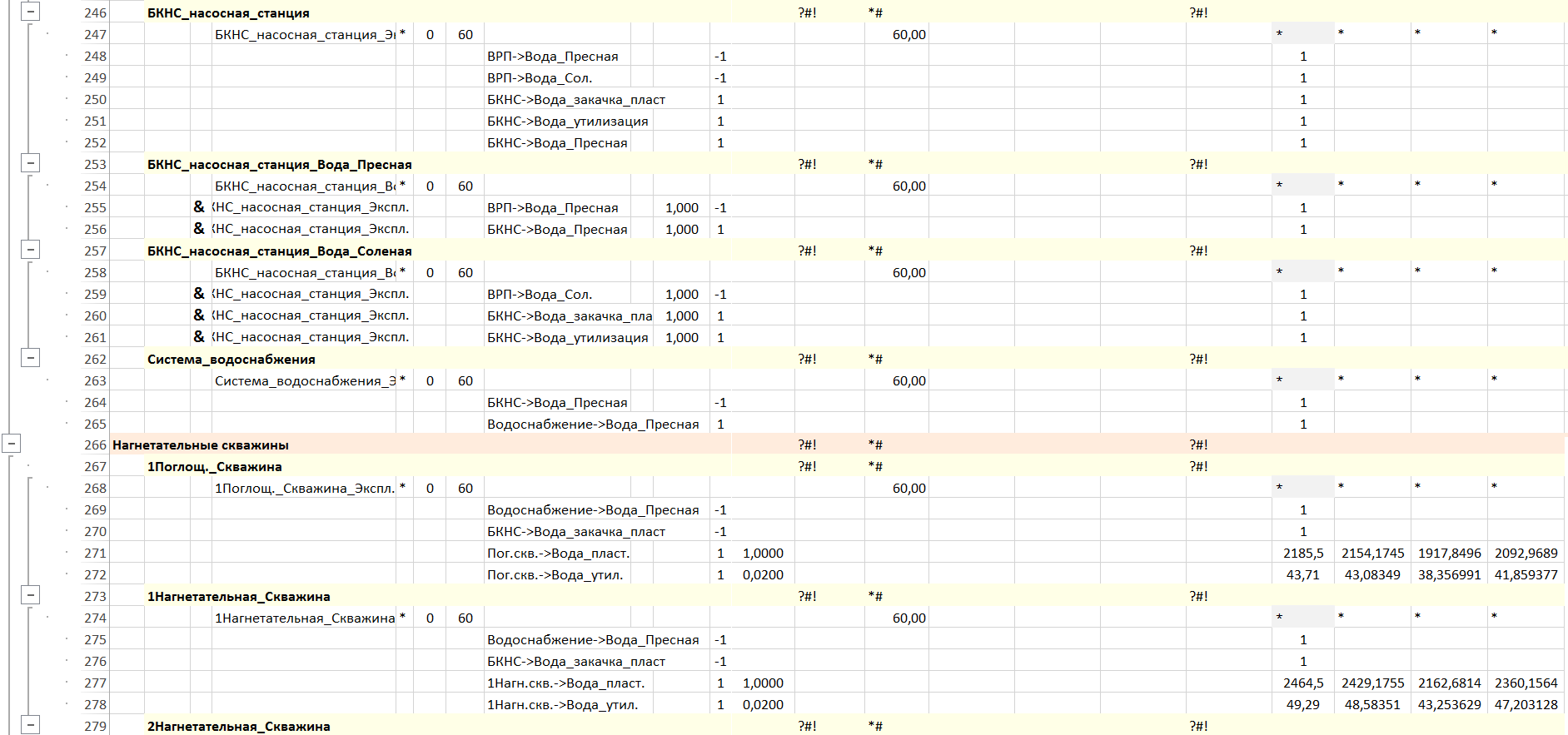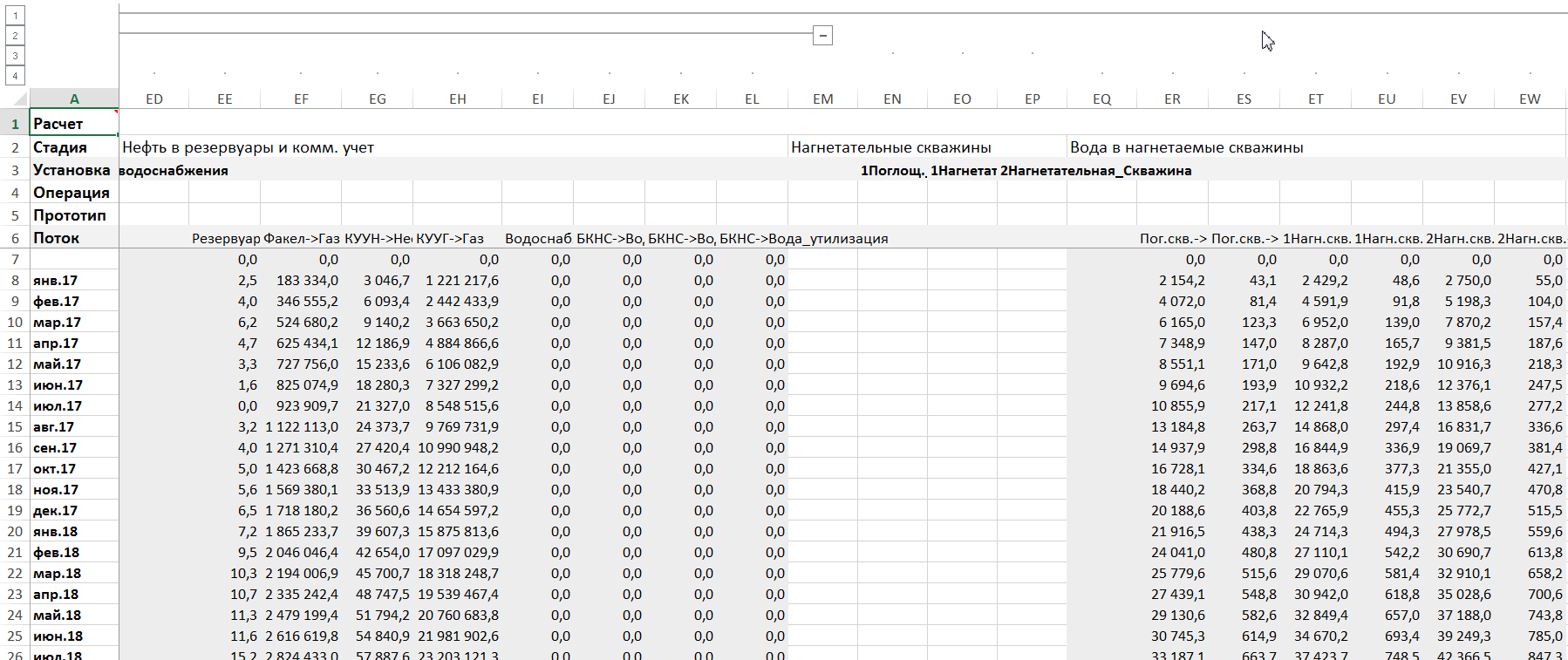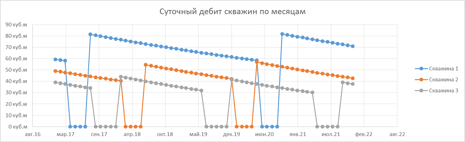 Моделирование месячных балансов объектам нефте и газодобычи на 5 лет с упрощенным учетом снижения дебита жидкости скважин и проводимых ГТМ.