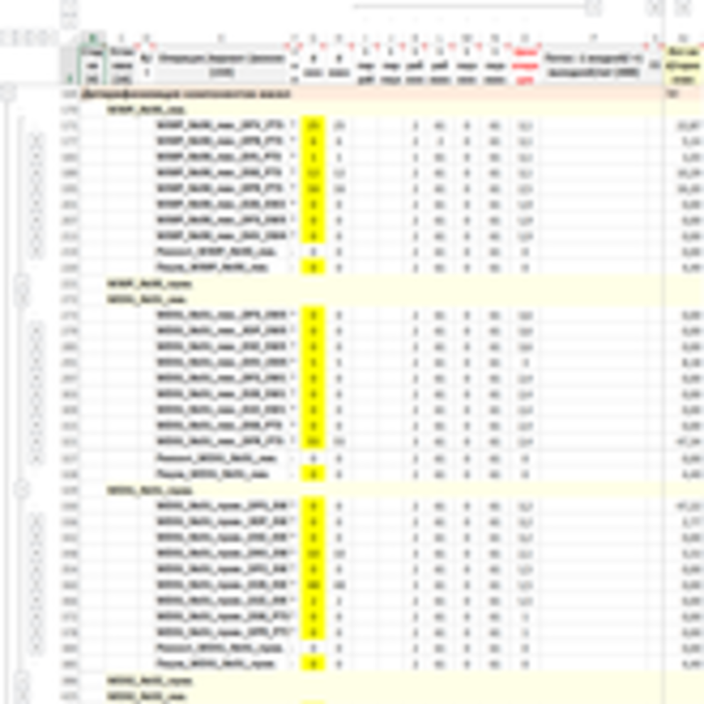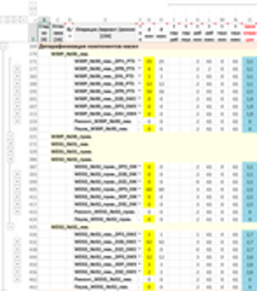 Детализация полученного месячного плана по сходным блокам, крыльям установок с сохранением общего объема выпуска и потребления. Учитываются приоритеты работы блоков, приоритеты сырья для блоков, равномерность загрузки. Пример детализации по крыльям установок депарафинизации (30, 31, 32)