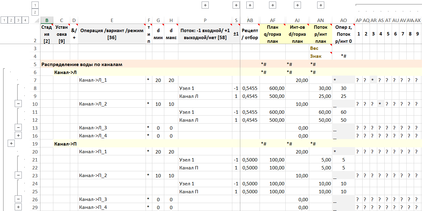 Укомплектовав графики полива, получим расходы по каждому участку. Аналогично суммируются расходы воды с учетом потерь по всем уровням иерархии, начиная снизу. Дойдя до верхнего уровня, получим расход — водозабор из водохранилища в магистральный канал через головное водозаборное сооружение. Также вычисляются расходы во всех узлах вододеления по всем уровням иерархии. Итак, оперативный план водораспределения в оросительной системе составлен.