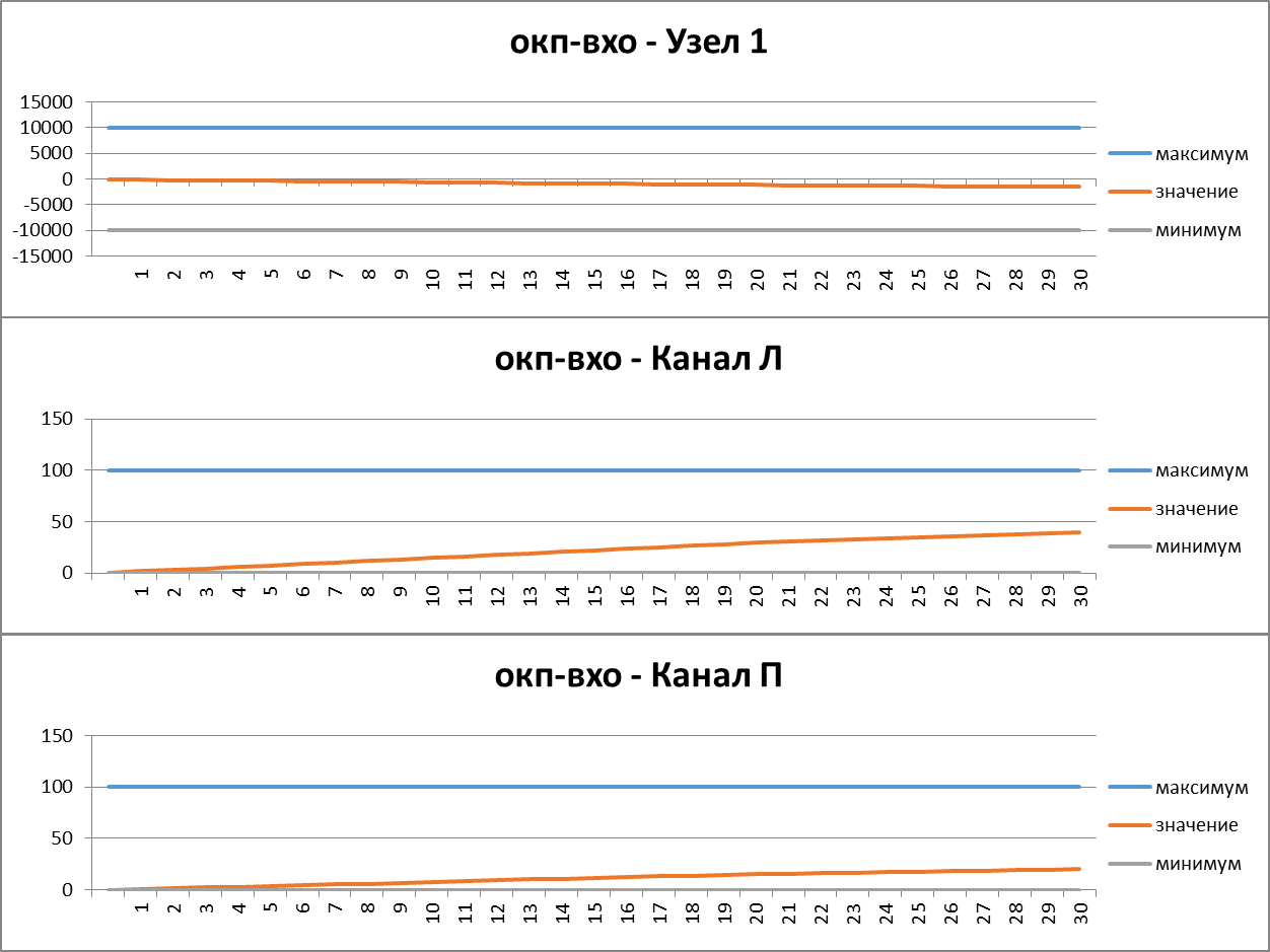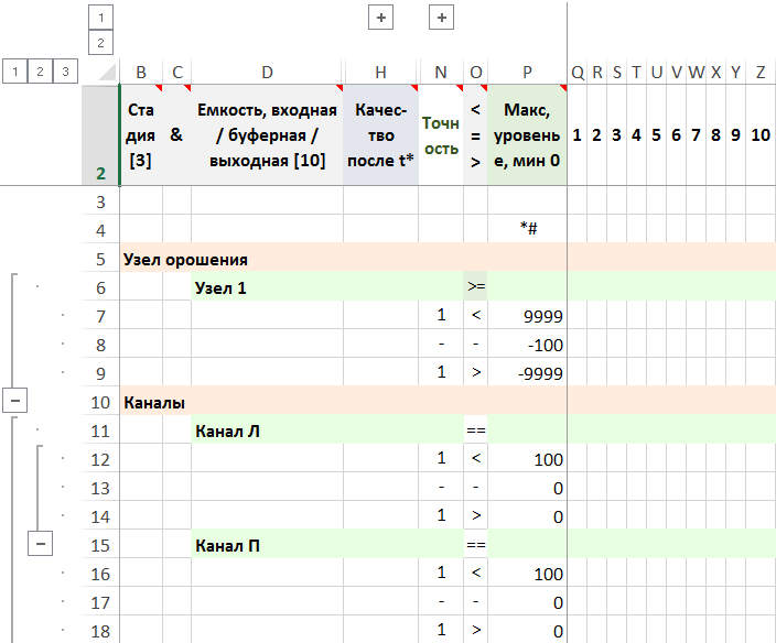 Задаются ограничения на нижнюю и верхнюю границы промежуточных емкостей, соответствующие ограничениям на объемы каналов для орошения.