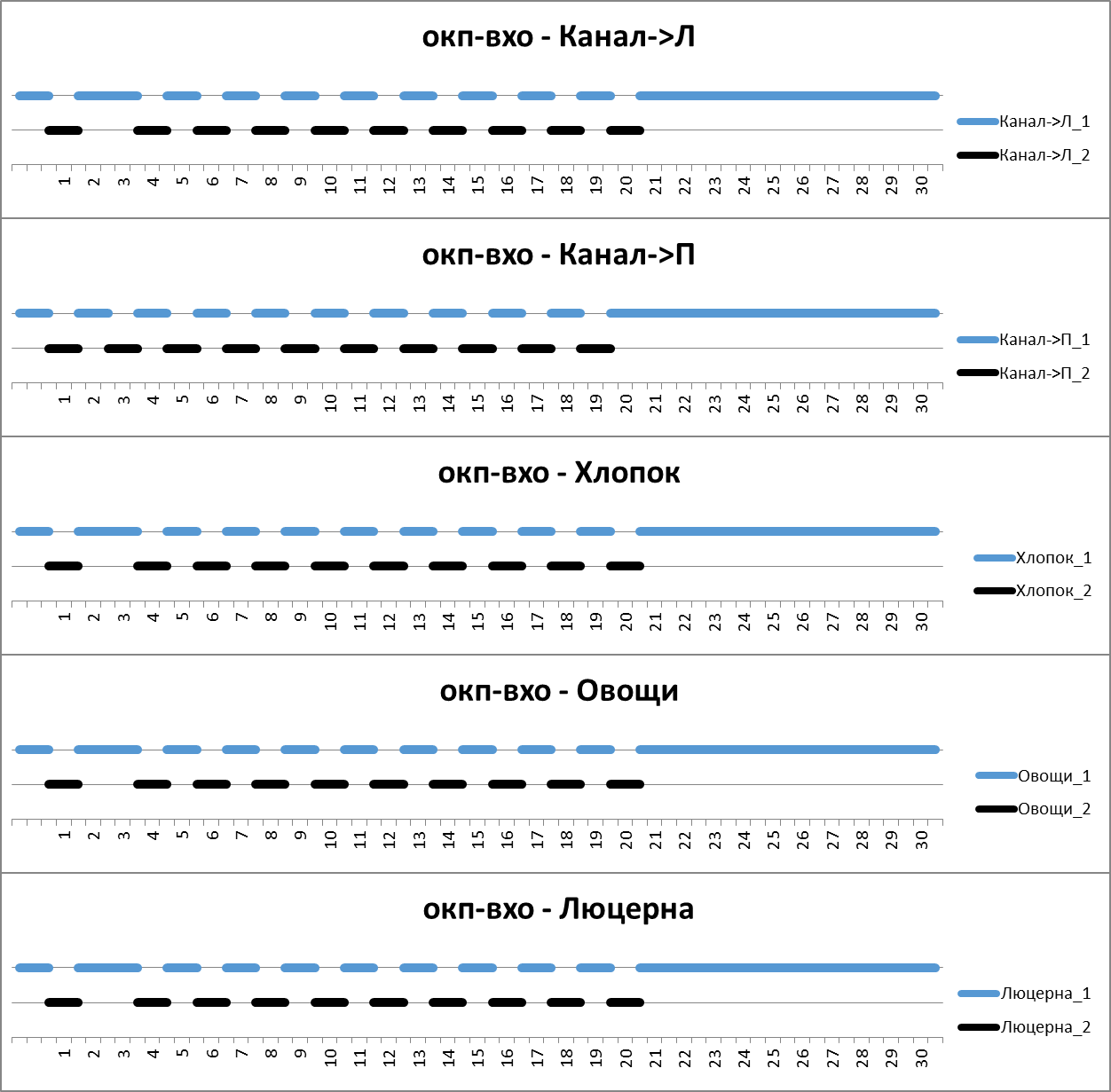 Такой подход правомерен только для оросительных систем со стационарной поливной техникой (дождевальной, капельной, внутрипочвенной) при условии, что подводящая распределительная оросительная сеть может обеспечить по пропускной способности одновременную работу всех подвешенных к ней поливных участков. Обычно одна дождевальная машина или одно звено поливальщиков (при поверхностном самотечном поливе) обслуживает несколько поливных участков, т.е. может потребоваться одновременный полив одной машиной нескольких участков, что невозможно. В этом случае нужно укомплектовать графики полива всех поливных участков, связанных единым технологическим процессом (поливной и почвообрабатывающей техникой), что приведет к смещению режимов орошения на некоторых поливных участках, т.е. к установлению очередности полива и отклонению от оптимальных графиков. Процедура укомплектования графиков полива не рассматривается, т.к. она весьма специфична и требует специального исследования [1,с.59].